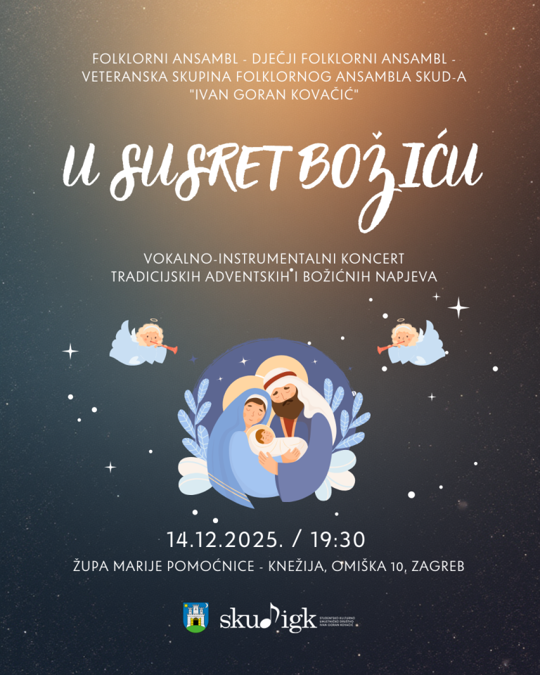 Pozivamo vas na vokalno-instrumentalni koncert tradicijskih adventskih i božićnih napjeva “U susret Božiću” koji će zajedničkim snagama izvesti Folklorni ansambl, Dječji folklorni ansambl te Veteranska skupina SKUD-a Ivan Goran Kovačić.